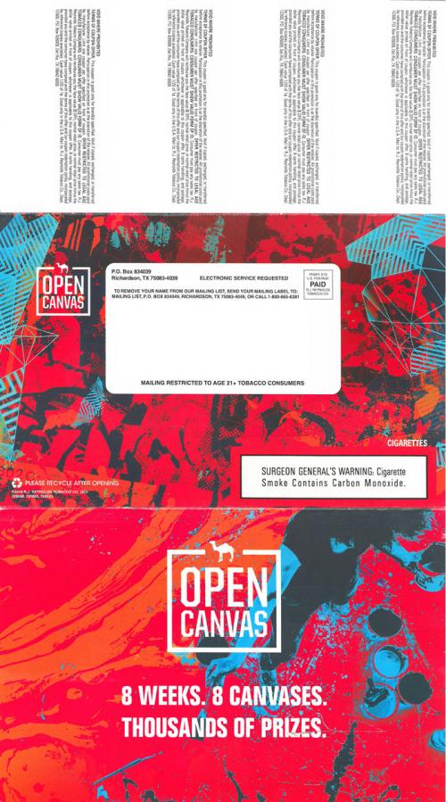 Direct mail from Camel received in July 2016 to promote the Open Canvas sweepstakes. Also includes coupons.