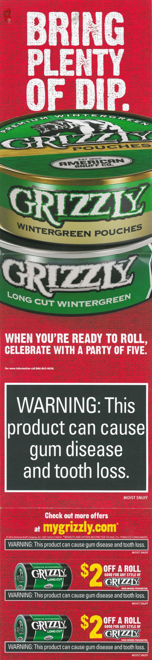 Direct mail from Grizzly received in June 2016 delivering coupons. Text: "Never arrive to the party empty handed. Bring plenty of dip. When you're ready to roll, celebrate with a party of five."