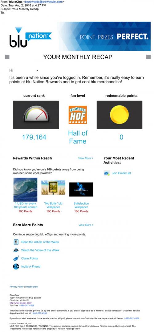 Blu email from August 2016 with a monthly recap for a rewards member. Reminds them to log in more often to earn points to exchange in the rewards program.