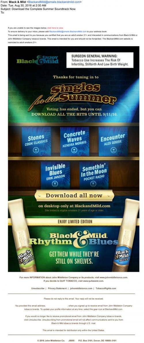 Black & Mild email in August 2016 linking to free music on the brand website to promote the limited-time products Rhythm & Blues cigars. Singles were released to vote on each week, and now all the winners can be downloaded.