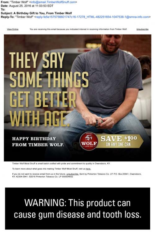 Email wishing the recipient a happy birthday from Timber Wolf in August 2016. Links to claim a coupon on the brand website. Text: "They say some things get better with age."