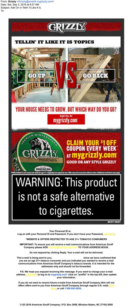 Grizzly email from September 2016 introducing the next "Tellin' it like it is" discussion topic on the brand website. Also links to claim a weekly coupon.