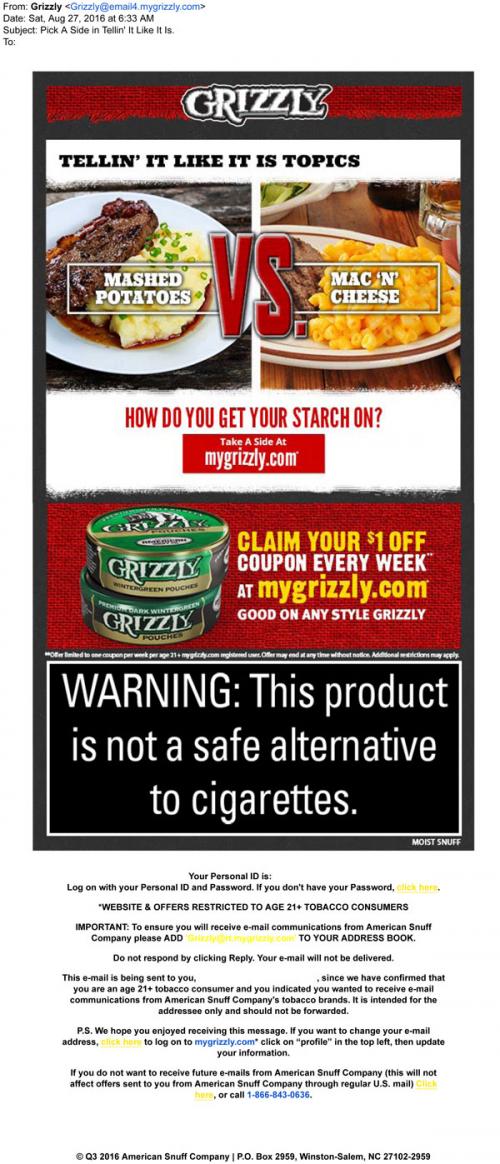Grizzly email from August 2016 promoting the newest "Tellin' it like it is" discussion topic, with a link to claim a weekly coupon on the brand website.
