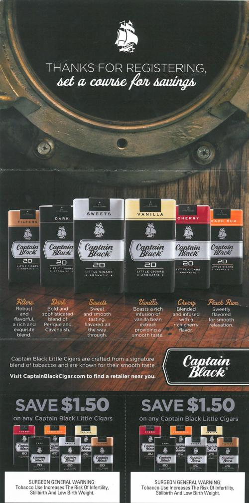 Direct mail from Captain Black welcoming a new customer in August 2016. Includes coupons and shows the full lineup of their cigar products.