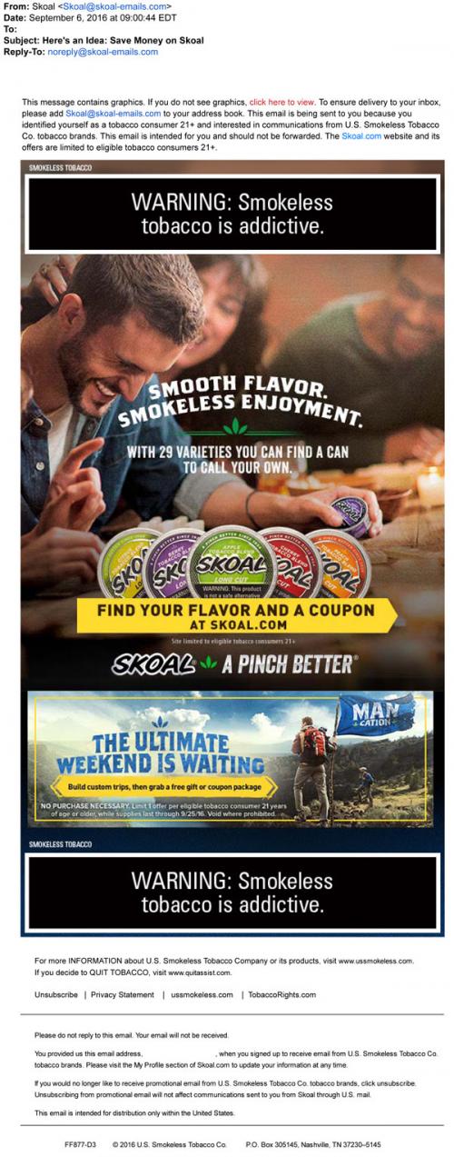Email from Skoal in September 2016 highlighting the various flavors to choose from among their products. Also promotes the Mancation sweepstakes, with a link to the brand website to enter.