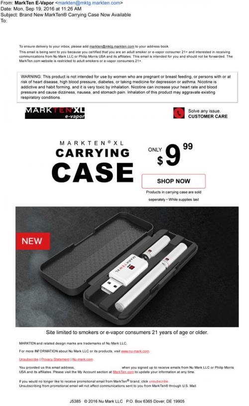 Email from MarkTen in September 2016 announcing a new carrying case for their XL e-cig product, now available to buy in the online store. Provides a link to the brand website to purchase.