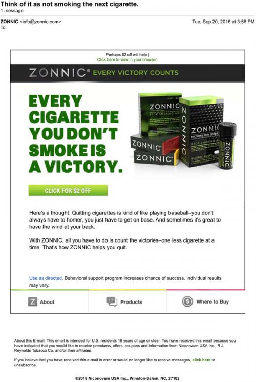 Email from Zonnic in September 2016 with a link to claim a coupon off their cessation aids products. Text: "Every cigarette you don't smoke is a victory."