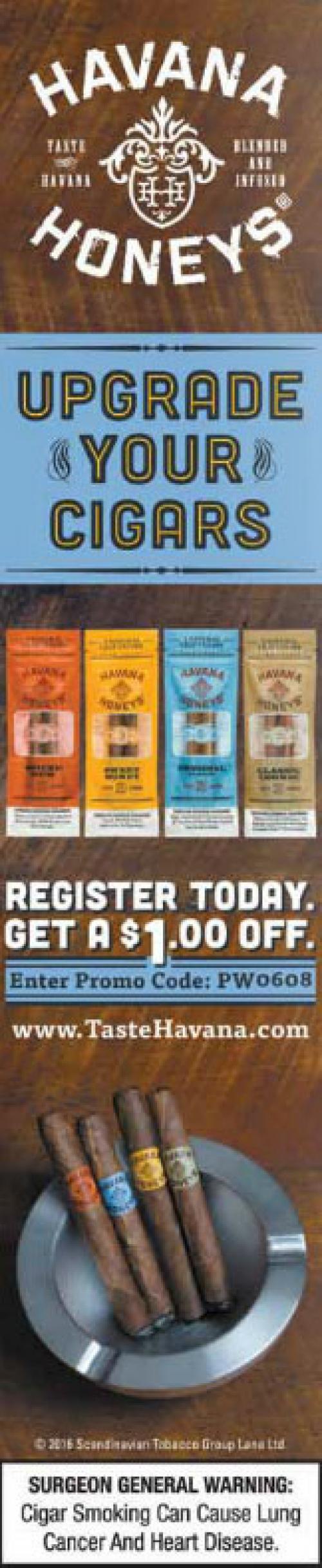 1/4 page magazine ad for Havana Honeys, "Upgrade your cigars." Includes a promo code incentive to register on the brand website and receive a coupon.