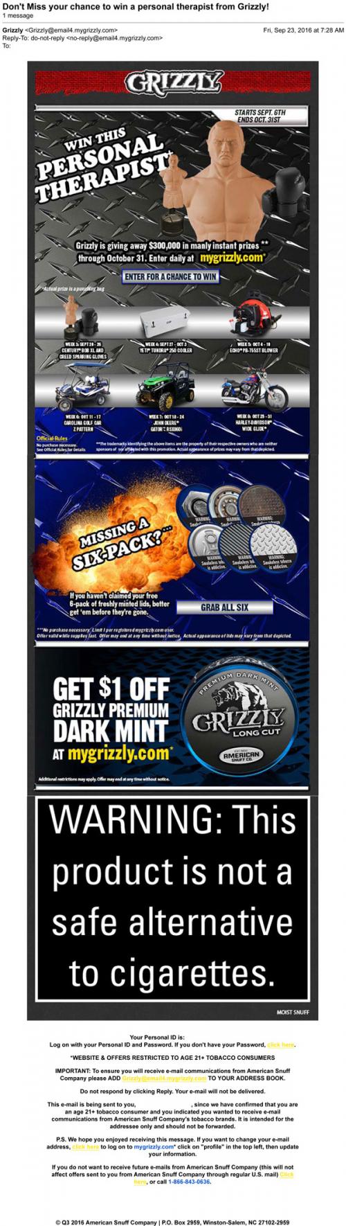 Grizzly email from September 2016 continuing the promotion of their "manly instant prizes" giveaway. Also features the dark mint product in a link to claim coupons, and a reminder to claim a free gift of new metal can lids.