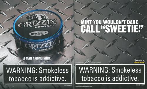 2-page magazine ad for Grizzly emphasizing how manly their Dark Mint product is - "a man among mint." Text: "Mint you wouldn't dare call 'sweetie.'"