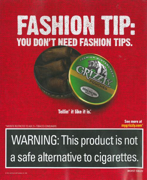 Single page version of a Grizzly ad from the "Tellin' it like it is" series. Focus is on their pouch products. Text: "Fashion tip: you don't need fashion tips."