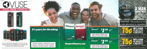 Direct mail with coupons and ads for several brands in September 2016, in association with the 7-Eleven convenience store chain. Promotes both Newport menthol and non-menthol styles, the various Vuse flavors, and the new Grizzly dark mint, "a man among mint."
