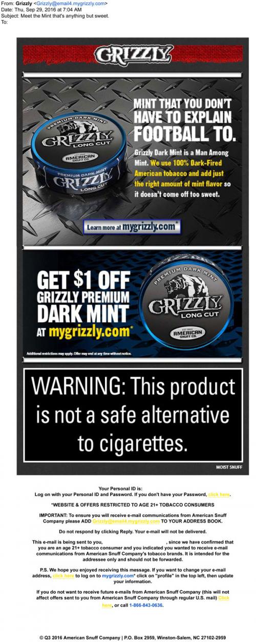 Email from Grizzly in September 2016 promoting the new dark mint flavor, "a man among mint," "that you don't have to explain football to." Links to the brand website to learn more and claim a coupon.