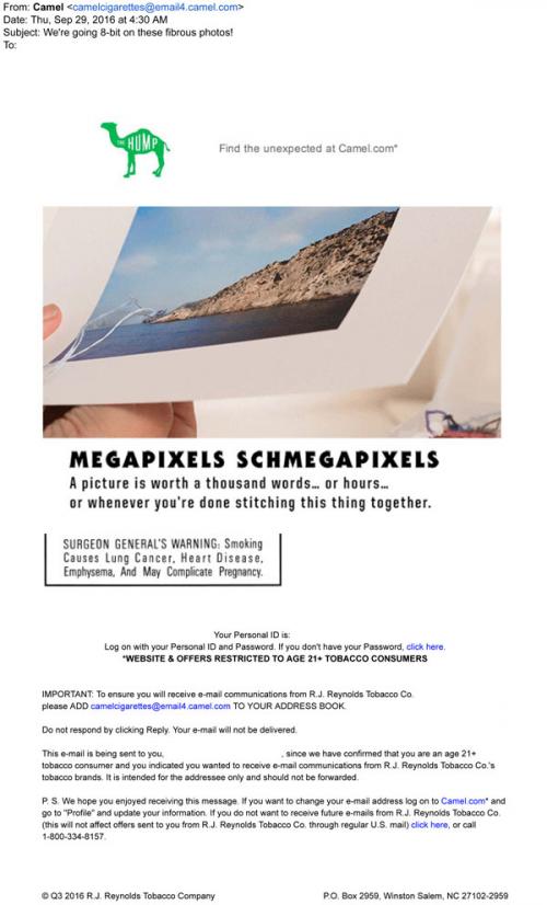 Email from Camel in September 2016 with a link to the newest Hump special article feature on the brand website.