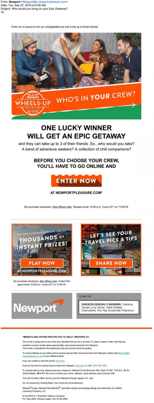 Newport email from September 2016 promoting the Wheels Up sweepstakes, with a link to the brand website to enter. Also solicits travel pictures and tips from recipients of the email to share with other site visitors.