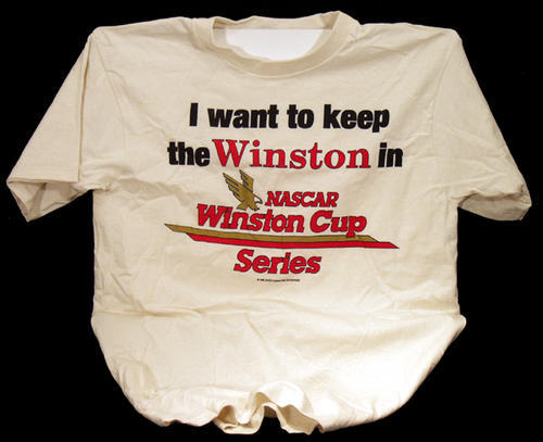 White t-shirt "I want to keep the Winston in Nascar. Winston Cup Series" with logo on front. The back reads "Let Nascar make the rules...not the FDA" with the Winston Cup logo.
