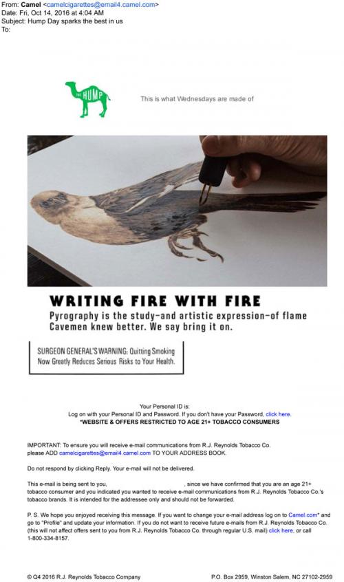 Email from Camel in October 2016 promoting the weekly weird articles for the Hump Day feature on the brand website.