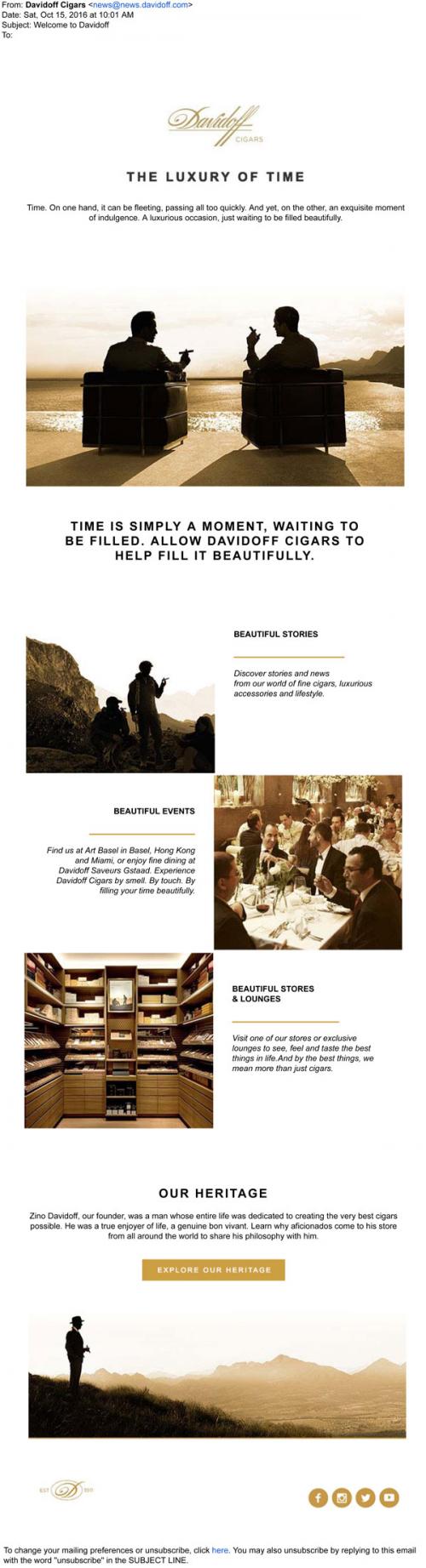 Email from Davidoff cigars in October 2016 with a welcome message for a new customer. Includes images suggesting luxury links to the brand website to learn more about the brand and its history. Also links to various social media outlets.