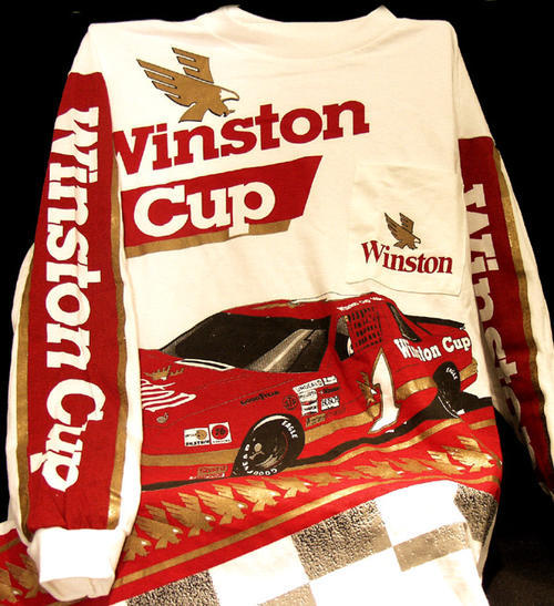 White long sleeved shirt. "Winston Cup" down the arms and across chest in racecar image. Winston logo on the front pocket. Back says "Winston Cup" and has a race car image. Red and gold images.