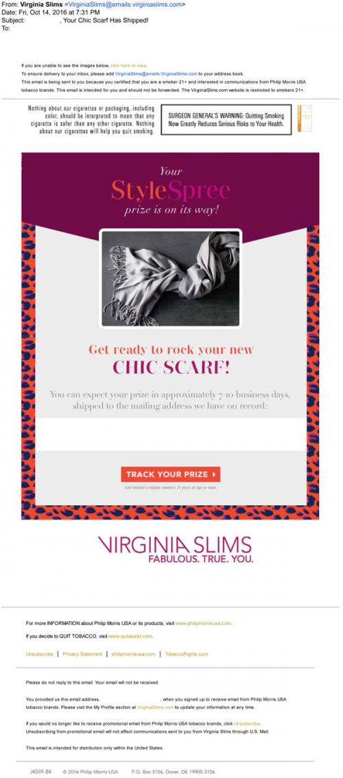 Email from Virginia Slims in October 2016 announcing the the mailing of a chic scarf to an instant winner, as part of the Style Spree sweepstakes.