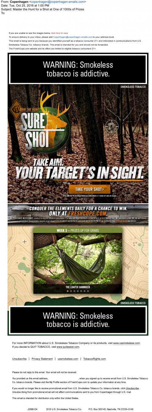 Email from Copenhagen in October 2016 to promote the Own the Hunt sweepstakes with a link to the brand website to play the Sure Shot game to win. Shows various prizes available to win that week.