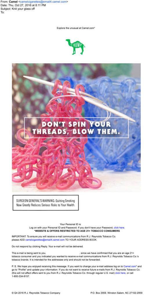 Camel email from October 2016 promoting the Hump feature on the brand website, which has interesting new articles every week. The article mentioned this time is about knitting glass.