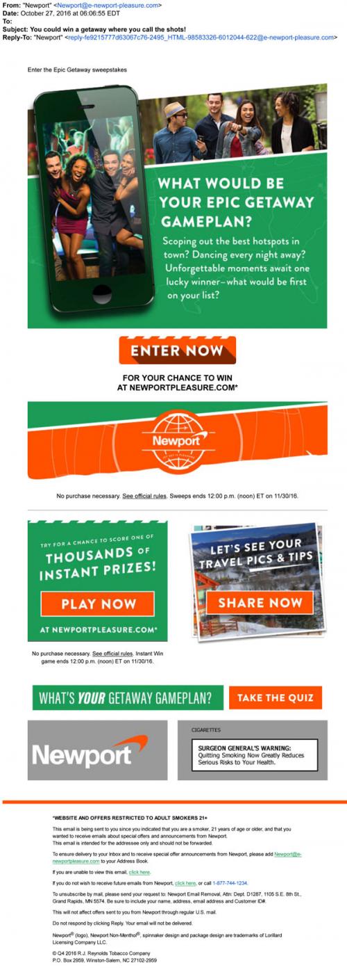 Newport email from October 2016 promoting the Epic Getaway sweepstakes, with a link to the brand website to enter for a chance to win or get instant prizes. Also promotes participating on the site with a request to share travel pics and tips, or take a quiz about your getaway game plan - what you would do on a trip if you won?