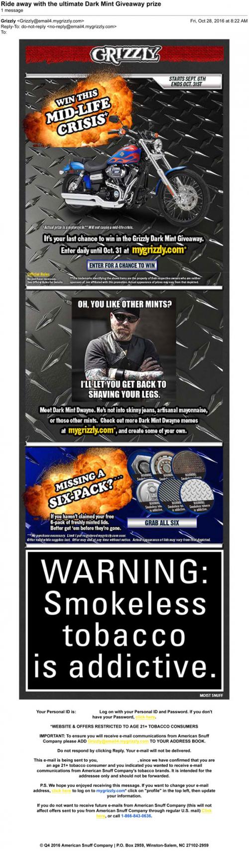 Email from Grizzly in October 2016 promoting the manly instant prize giveaway, reminding the customer that it's the last chance to win. Includes a link to the brand website for a chance to win the last prize, a motorcycle. Also has a link to claim a set of free metal can lids and the opportunity to create a unique Dark Mint Dwayne meme.