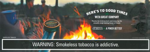 Direct mail from Skoal received in October 2016 delivering coupons. Imagery shows men camping. Includes a reminder to sign up for weekly mobile coupons on the brand website. Text: "Here's to good times with great company."