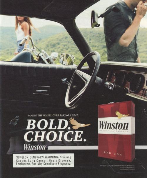 Magazine ad from Winston with a woman and a man seen from the inside of a car. Also has a motorcycle. Text: "Taking the wheel over taking a seat. Bold. Choice."