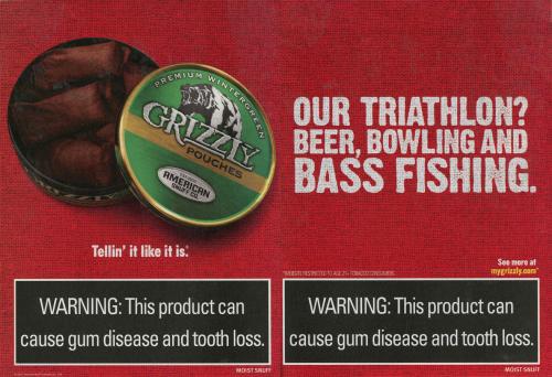2-page Grizzly ad from the "Tellin' it like it is" series. Features a picture of their Wintergreen pouch product. Text: "Our triathlon? Beer, bowling and bass fishing."