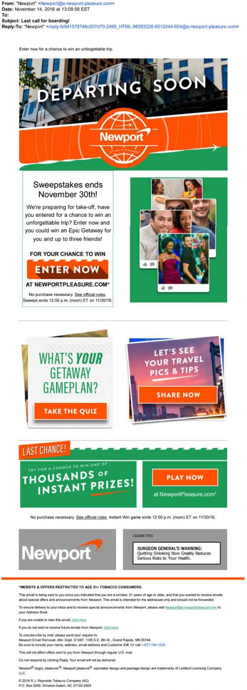 Newport email from November 2016 with a reminder about the end of the Epic Getaway sweepstakes. Invites the recipient to enter on the brand website and interact with other by sharing travel pics and tips, and taking a quiz.