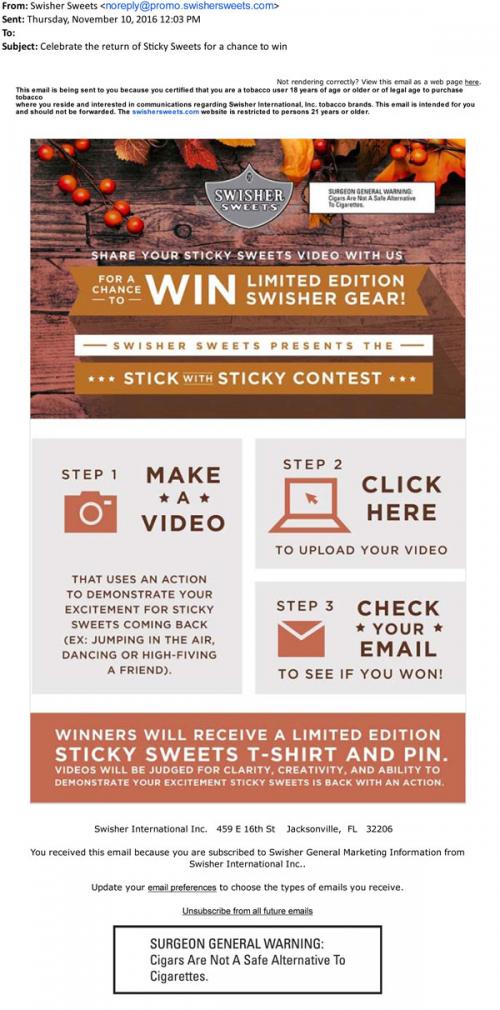 Email from Swisher Sweets in November 2016 celebrating the return of their Sticky Sweets product with a "Stick with Sticky" contest. Customers are encouraged to take a video showing their excitement for the product's return and share it with the brand via a link for a chance to win.