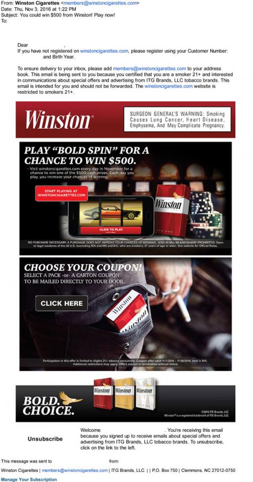 Email from Winston in November 2016 promoting the Bold Spin sweepstakes, with a link to the brand website to play. Shows a mobile phone to suggest that the game can be played on a mobile device. Also provides a link to claim coupon on the site that will be sent via mail.