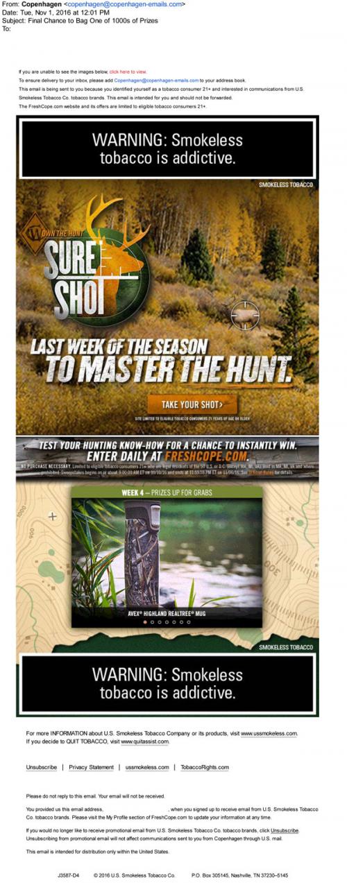 Copenhagen email from November 2016 reminding the recipient that it's the last week to enter the Own the Hunt sweepstakes and play the Sure Shot instant win game. Shows the prizes available to win and provides a link to the brand website to enter.
