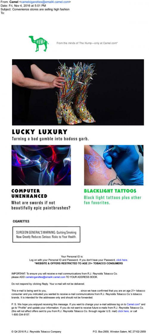 Camel email from November 2016 promoting their feature called the Hump, that has unique articles and artists every week.