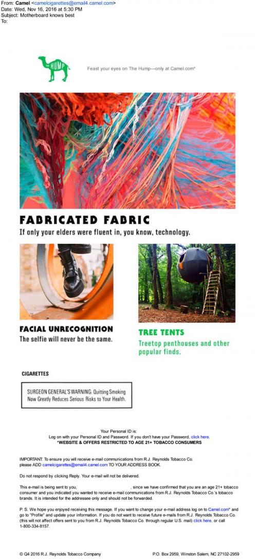 Camel email from November 2016 promoting their feature called the Hump, that has unique articles about technology and art every week.
