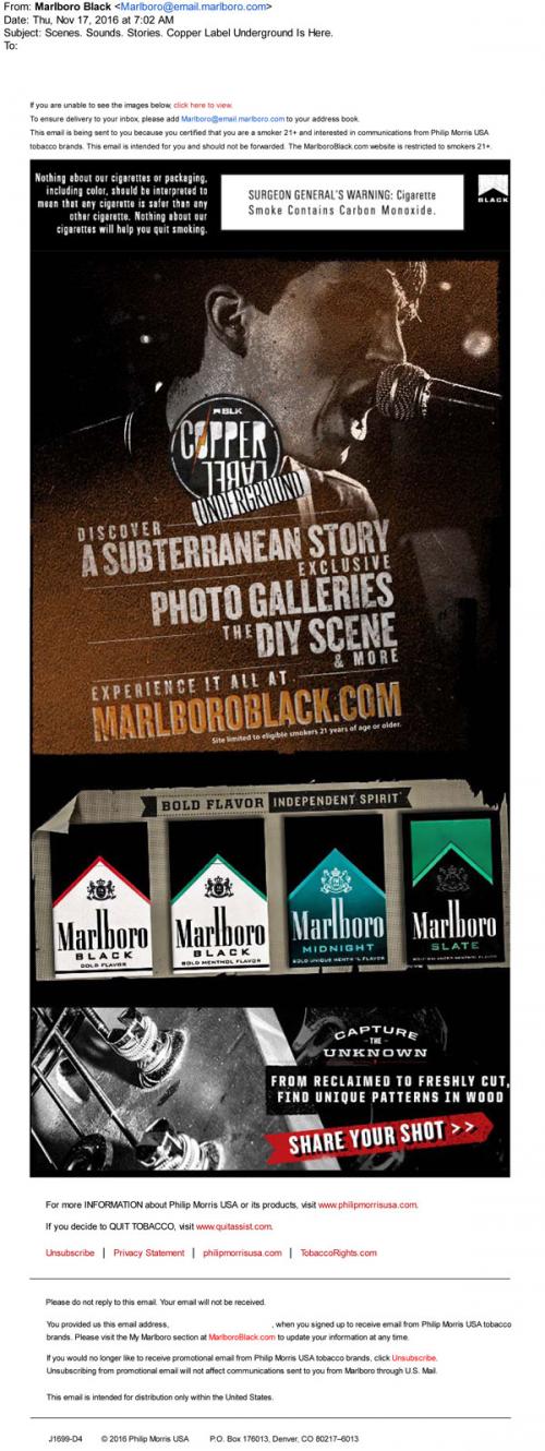 Email from Marlboro Black in November 2016 promoting the Copper Label: Underground series, with exclusive photos from the DIY music scene offered on the brand website. Includes a lineup of the bold flavors, including the menthol ones, and links to share photos in the Capture the Unknown project.