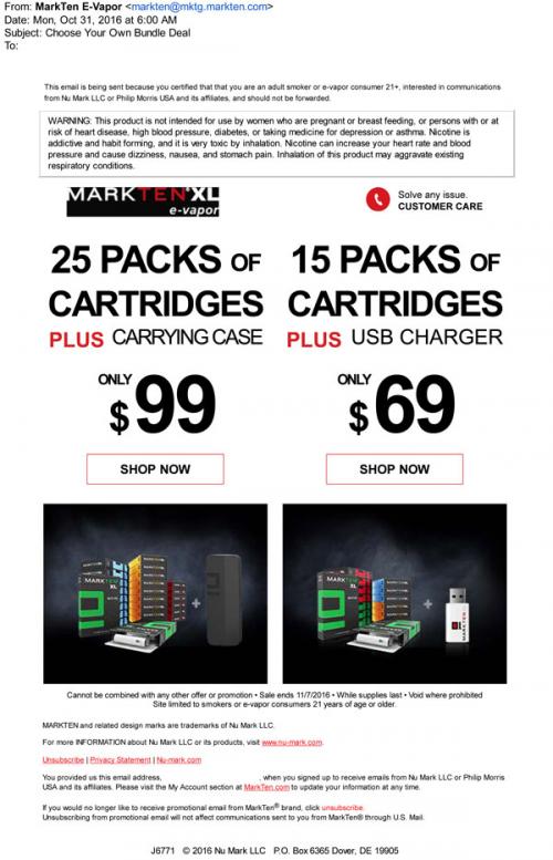 MarkTen email from October 2016 promoting a bundle sale of cartridges and a carrying case or USB charger with purchases made through the brand website. Provides a link to shop and get the discount.