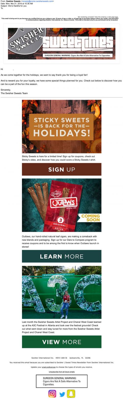 Email from Swisher Sweets in November 2016 for the holidays, thanking their customers for being loyal fans. Provides updates with what is happening with the brand, including a return of Sticky Sweets for a limited time; new blends for Outlaws, their hand-rolled natural leaf cigars; and a festival event in Atlanta, GA for A3C with the Swisher Sweets Artist Project and Chanel West Coast. Provides a link to the brand website to read more and see videos, sign up for mailing lists to receive updates on these various products, get coupons, and even have the chance to get a free Sticky Sweets t-shirt.