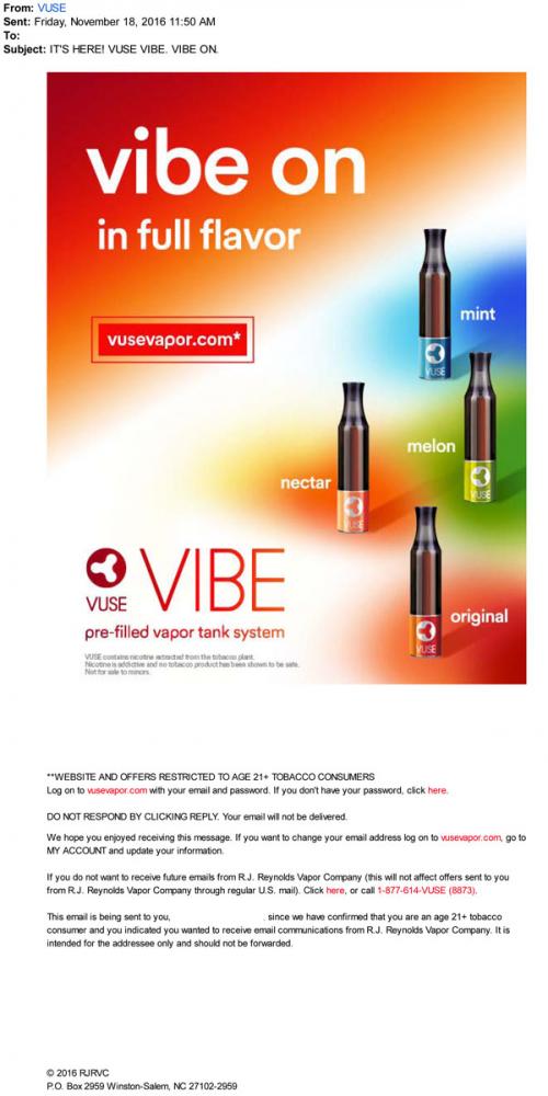 Email from November 2016 introducing the new pre-filled tank system from Vuse called Vibe, and the several flavors available: mint, melon, nectar, and original.