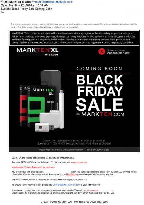 Email from MarkTen in November 2016 promoting the upcoming Black Friday Sale on the brand website.