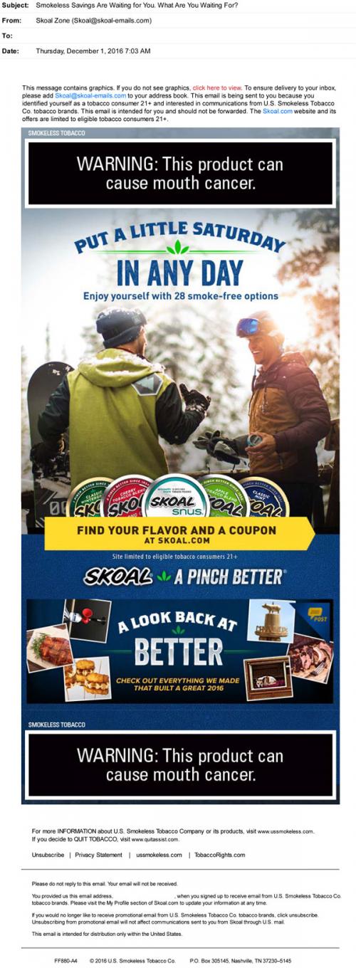 Email from Skoal in December 2016 with a link to claim a coupon on the brand website and "put a little Saturday in any day" by discovering a variety of flavor options. Includes an invitation to interact with a little nostalgia trip with the brand over the past year.