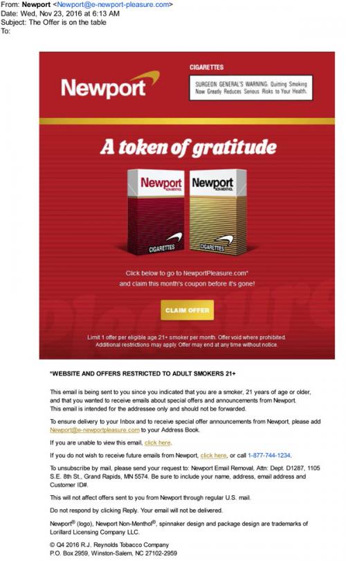 A non-menthol version of an email sent by Newport in November 2016 with a link to claim a monthly coupon on the brand website.