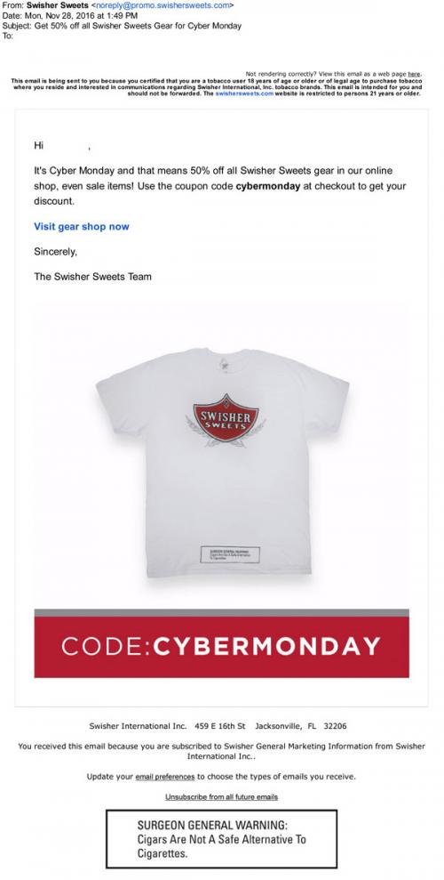 Email promoting Swisher Sweets' Cyber Monday sale in November 2016. Customers could get discounted gear with the provided code.