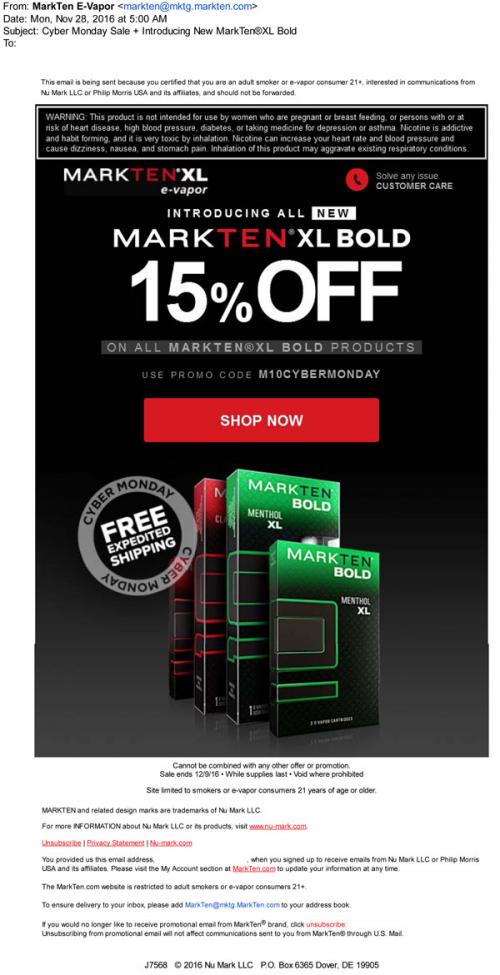 MarkTen email from November 2016 promoting their Cyber Monday holiday sale with a discount code for their new XL Bold products. Provides a link to the brand website to shop.