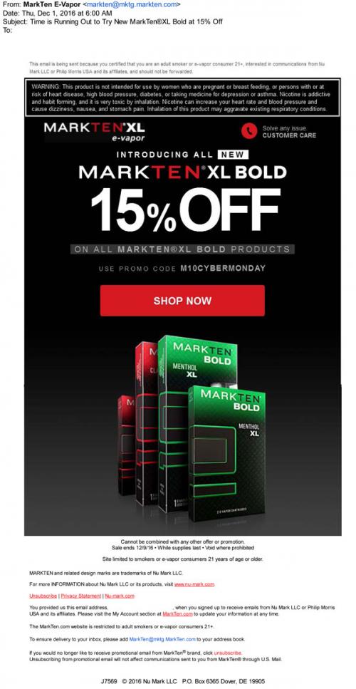 MarkTen email from December 2016 promoting a continued discount on their new XL Bold products. Provides a