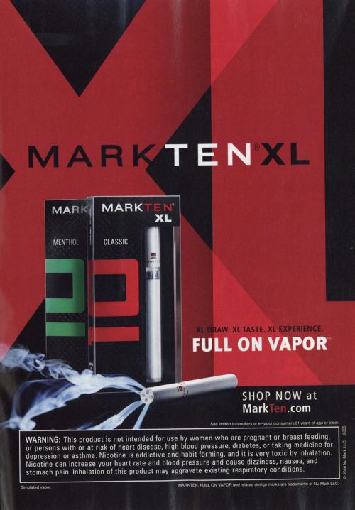 MarkTen magazine ad for their XL product; image shows vapor from the e-cig and their classic and menthol styles.