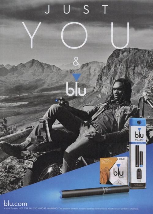 Magazine ad from Blu with the "Just you & blu" slogan featuring the African-American man on his bike with a scenic vista in the background. This version also shows an image of the blu PLUS+ product and cartridges.