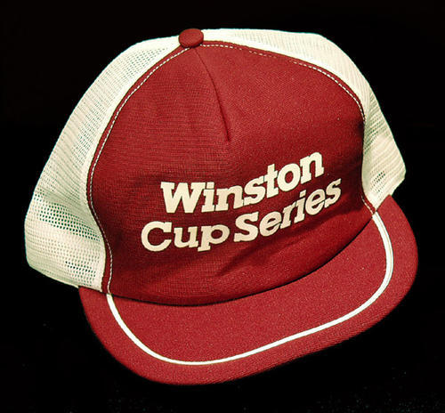 Red and white baseball hat "Winston Cup Series" in written on the front in white.